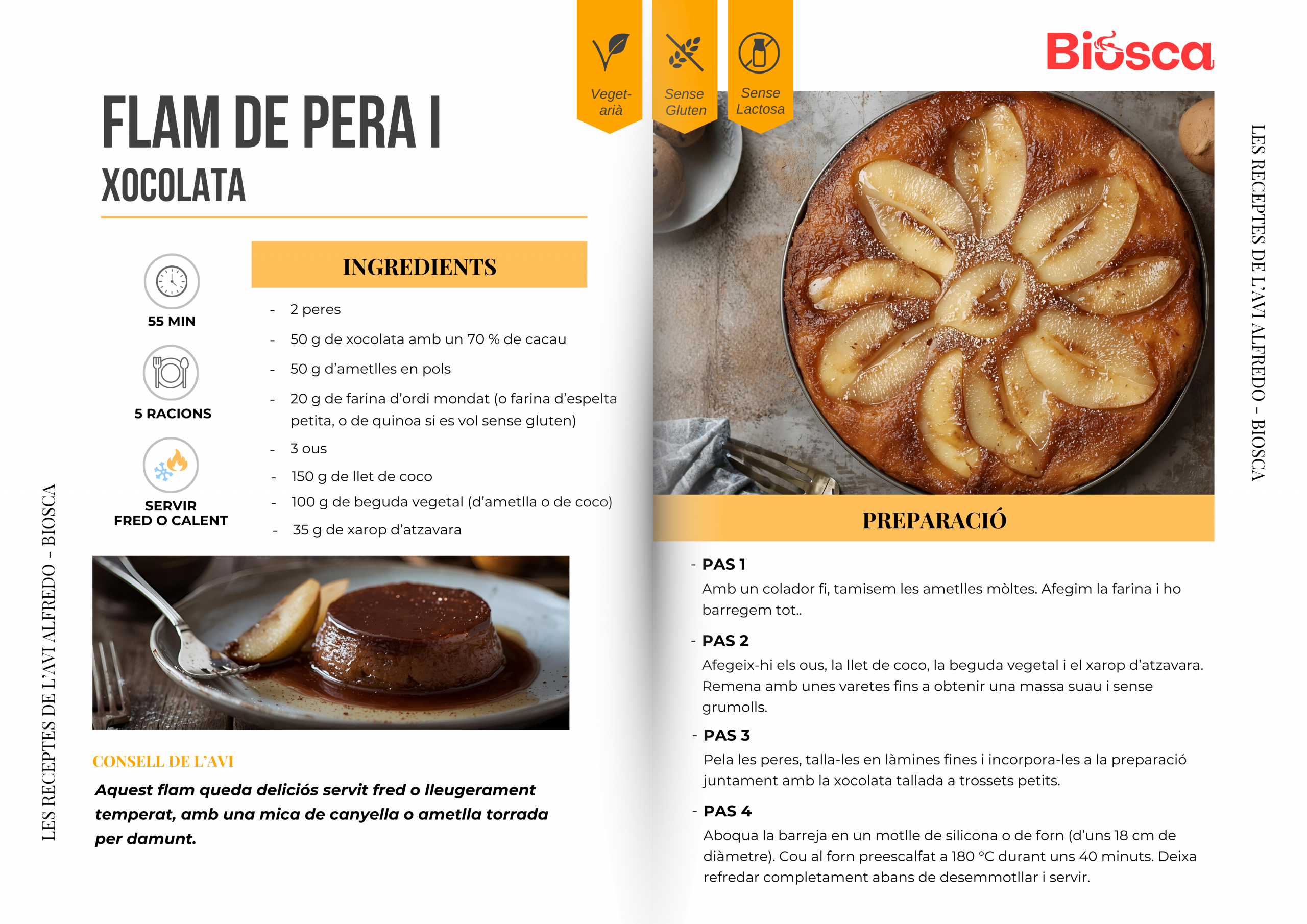 Aquest flam queda deliciós servit fred o lleugerament temperat, amb una mica de canyella o ametlla torrada per damunt.