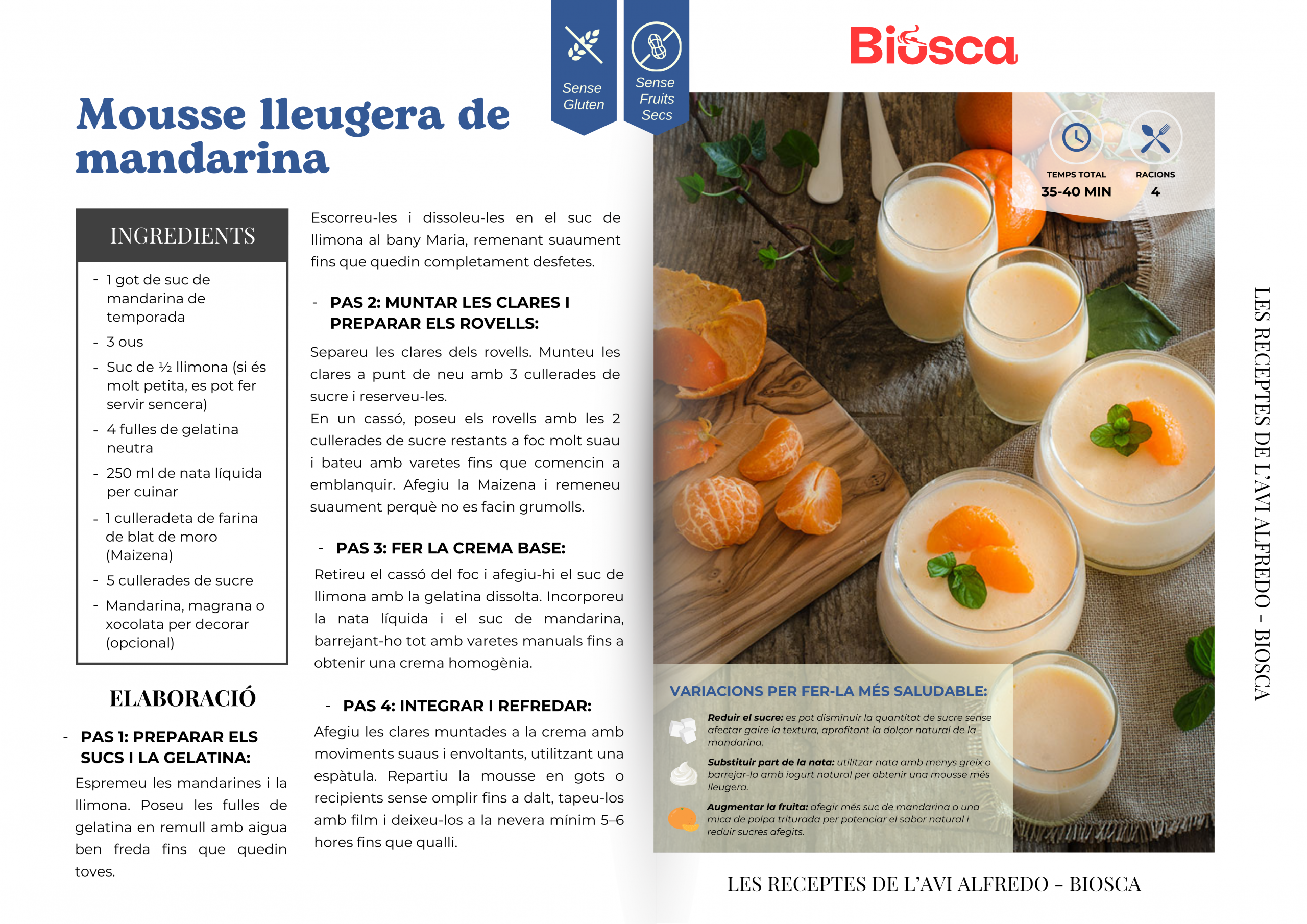 - Augmentar la fruita: afegir més suc de mandarina o una mica de polpa triturada per potenciar el sabor natural i reduir sucres afegits.