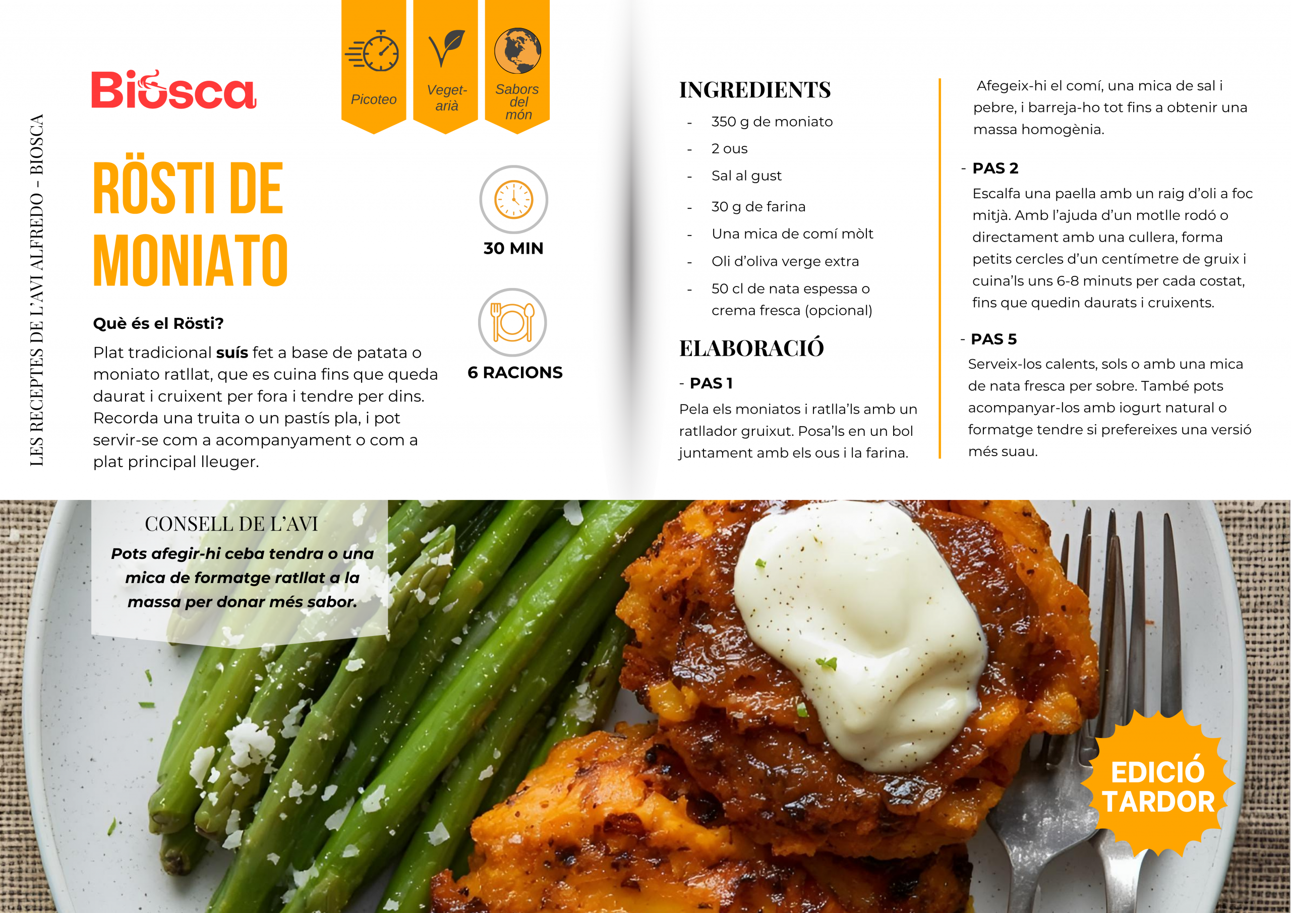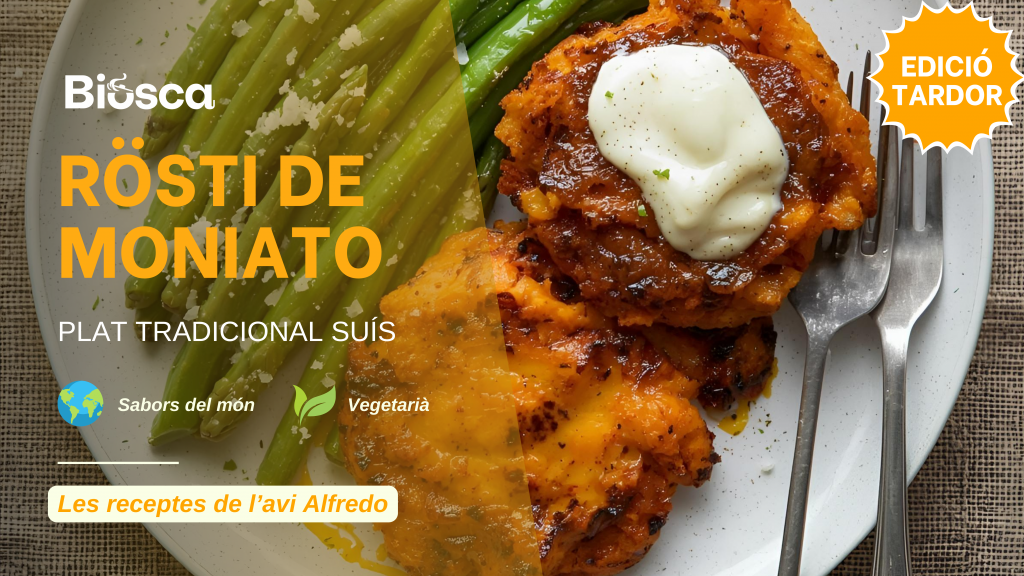 A Biosca ens agrada unir el millor dels productes de temporada amb nous sabors que ens fan viatjar pel món. Aquest rösti de moniato n’és un bon exemple: una recepta d’origen suís que hem adaptat amb un ingredient molt nostre i de plena tardor, el moniato. Cruixent per fora i tendre per dins, és ideal com a picoteig o acompanyament, i una manera divertida de descobrir receptes del món amb aliments de proximitat.