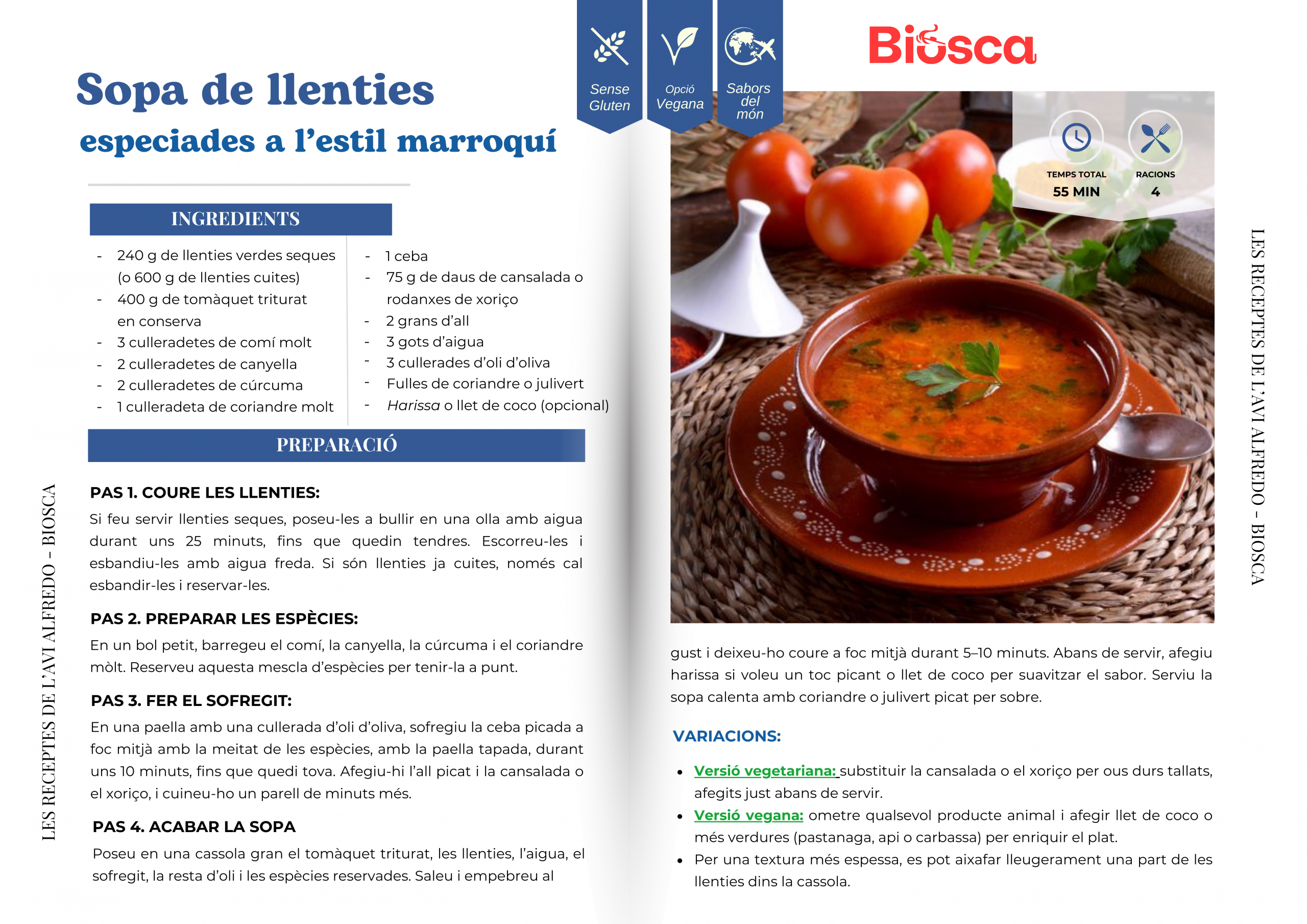 La sopa marroquina de llenties amb espècies és un plat tradicional del nord d’Àfrica, molt present a la cuina quotidiana del Marroc. Les llenties, combinades amb tomàquet, espècies aromàtiques i una base senzilla, donen lloc a una sopa nutritiva, reconfortant i plena de matisos, ideal per als dies frescos. Aquest tipus de preparacions formen part de la cuina casolana marroquina, on les espècies aporten tant sabor com identitat cultural.